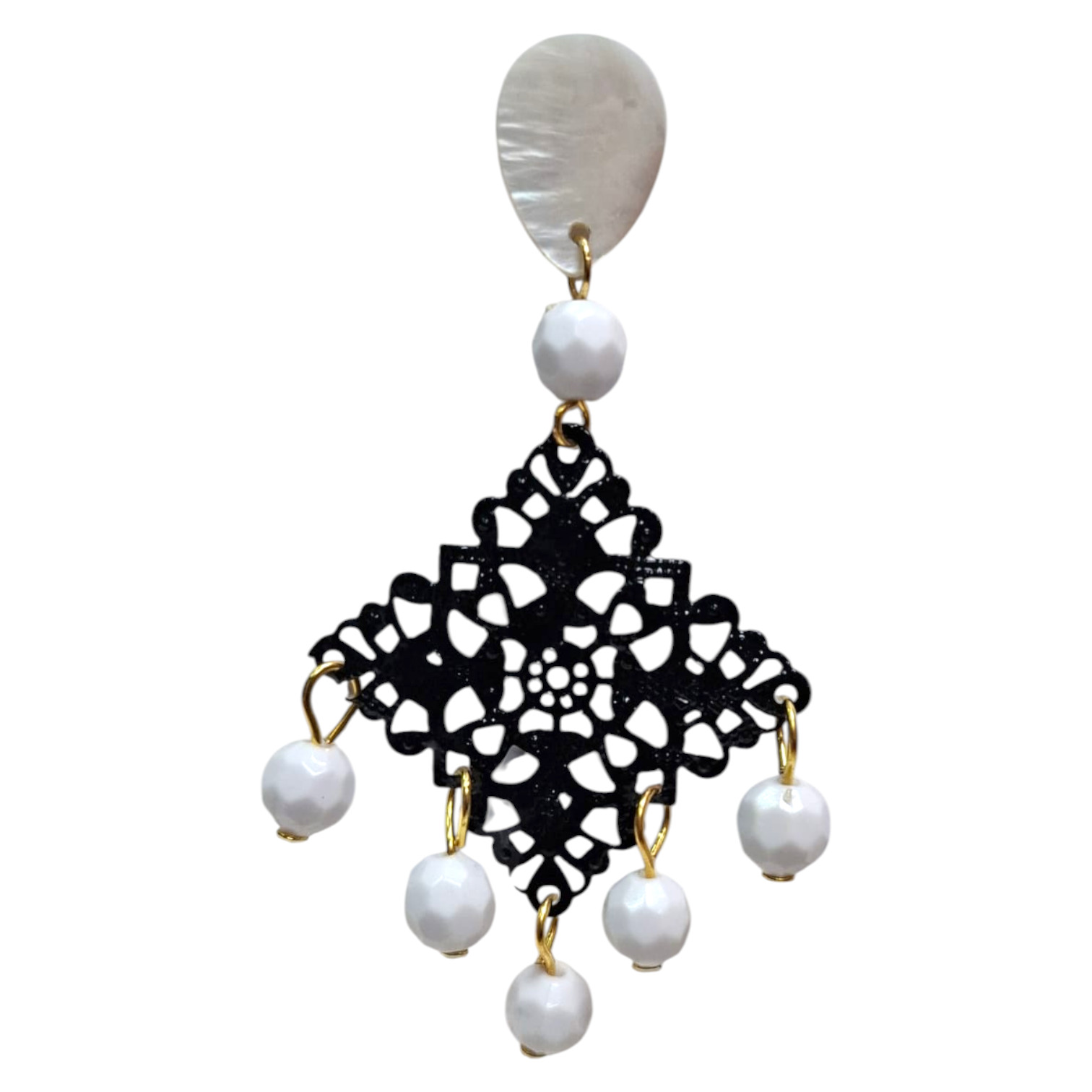 Pendientes de flamenca con rombo metálico de filigrana, decorados con bolas de plástico que aporta personalidad. Un complemento imprescindible para looks flamencos. Hechos en Sevilla (España) con estilo tradicional.