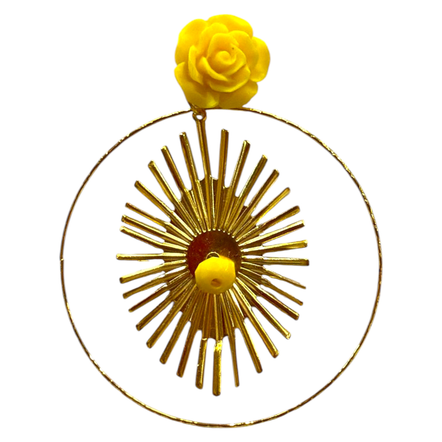 Pendientes de flamenca dorados con aro que envuelve un diseño de rayos interiores, piedra central decorativa y bolita colgante a juego en color amarillo. El cierre en forma de rosa aporta un acabado elegante y artesanal. Estos pendientes flamencos son ideales para ferias, romerías y eventos especiales, aportando luz, movimiento y sofisticación a cualquier look.