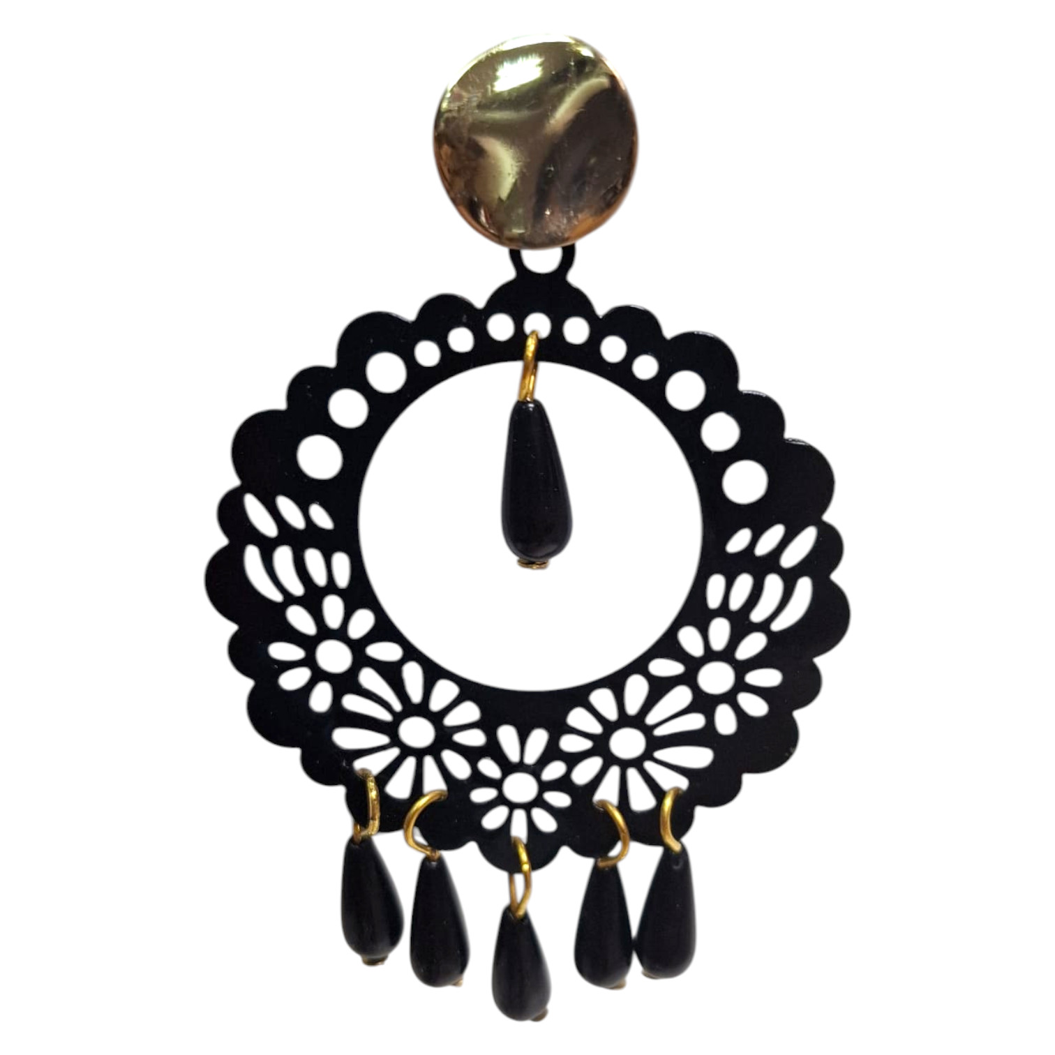 Pendientes flamencos grandes con diseño calado y lágrimas negras que aportan volumen y presencia. Ideales para quienes buscan un accesorio llamativo para feria, espectáculos o baile flamenco.