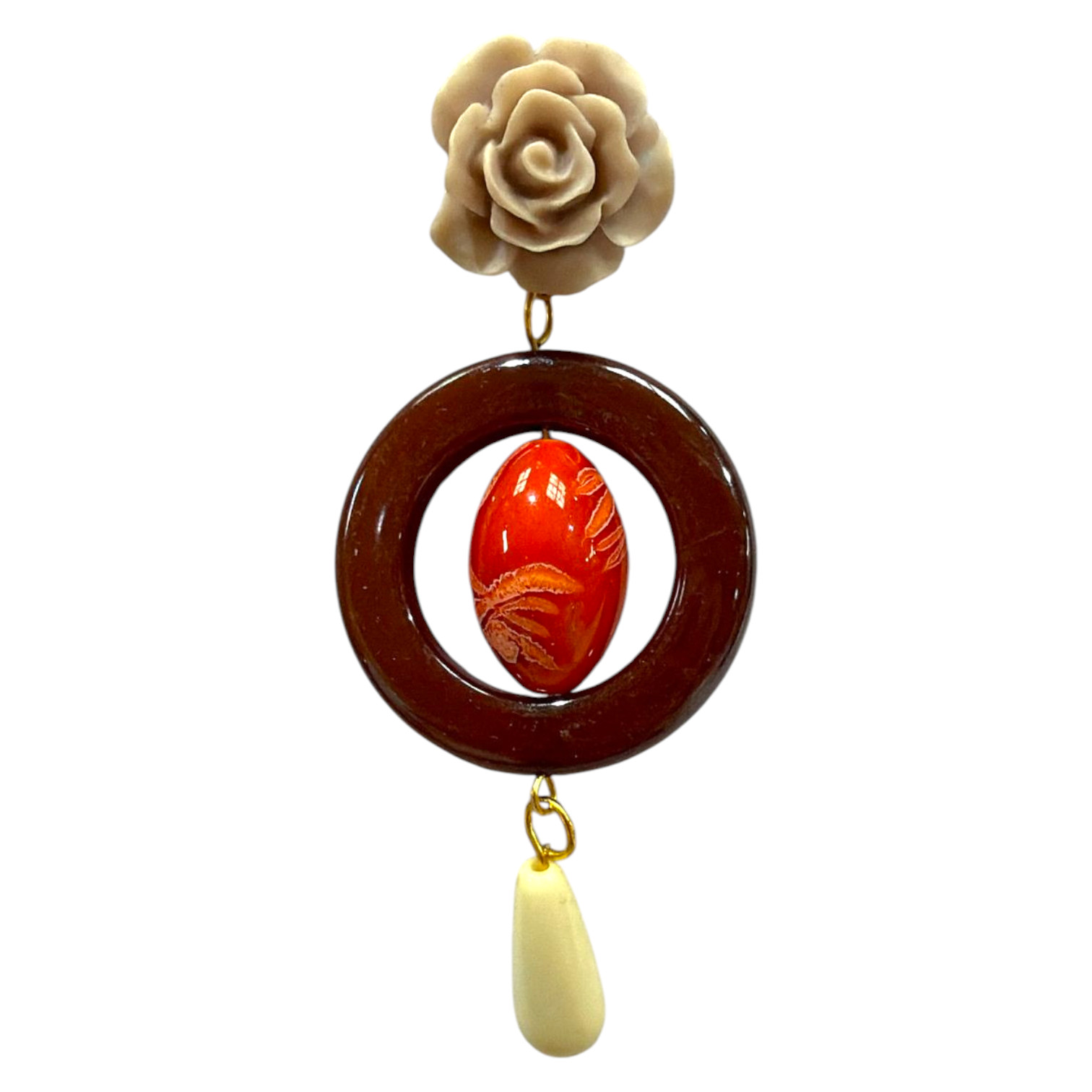 Pendientes de flamenca de estilo tradicional hechos a mano en Sevilla. Elaborados en resina con aro central, detalle ovalado y lágrima decorativa, destacan por su cierre en forma de rosa. Ideales para lucir en feria, romería o eventos de baile flamenco.