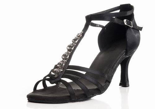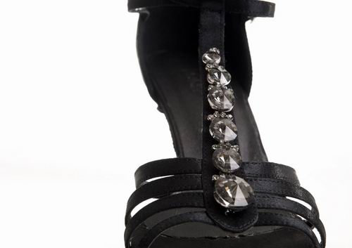 Elegant shoes for Latin dance. These shoes are really comfortable. Made of black satin and decorated with four strips. The fifth strip in the instep is decorated with crystals of different sizes and sewn from the largest to the smallest. They also have a split leather sole, a material specifically designed for dancing. With these shoes, you will spin and dance easily… and safely!