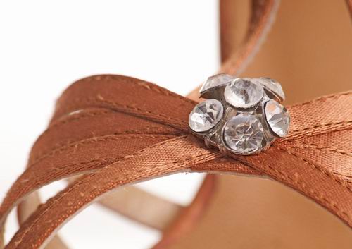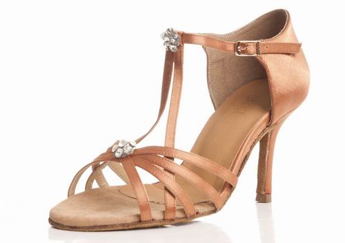 Spectacular shoes for Latin dance decorated with a V strip and jewels. Although they have high heel (8 cm), these dance shoes are really comfortable. They are made of ochre satin and have a split leather sole, a material specifically designed for dancing. With these comfortable shoes, you will spin and dance easily… and safely!