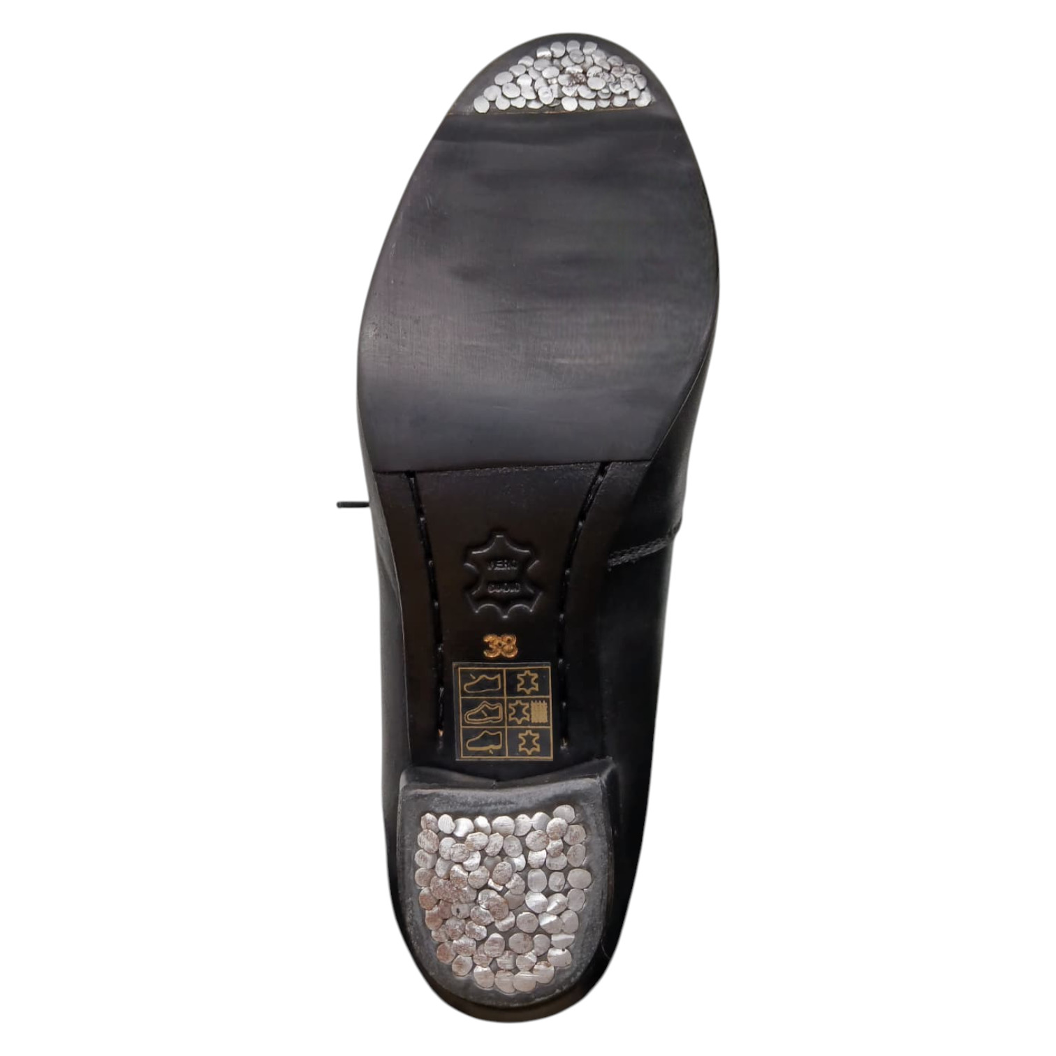 The stitched leather sole provides far greater durability than glued soles, with nails on toe and heel for a strong, defined sound. Equipped with replaceable filis (half soles), these shoes are built to last for years.