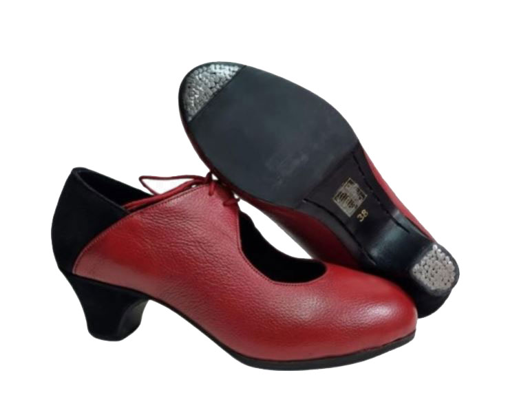 If you are looking to stand out on stage, the red and black semi-professional flamenco shoe is your best ally. This handcrafted model, handmade in Spain, combines the energy of the red colour on the front and the spool heel with the sobriety of black suede on the back, creating a modern and daring design. Its lace-up closure adds a sophisticated touch and is ideal for dancers who prefer a more refined style than the typical strap and buckle shoe.