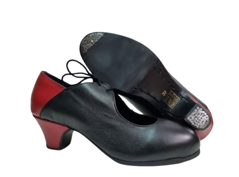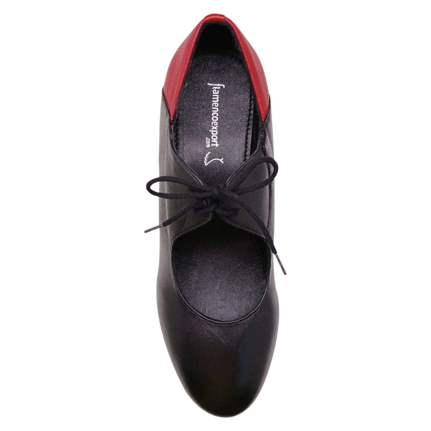 Discover the handcrafted semi-professional flamenco dance shoe, a unique creation handmade in Spain with high quality materials. This model combines the sobriety of the black leather on the front with the vibrant energy of the red colour on the back and the red leather heel. Ideal for flamenco dancers, this lace-up design is perfect for those looking for a modern alternative to the classic strap and buckle shoe.